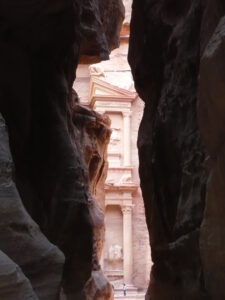 Bene o male tutti sanno già cosa aspettarsi nel percorrere la lunga e stretta gola che permette di rivivere le scene finali del film di Indiana Jones. Ma attraversando il Siq, il canyon che porta alla necropoli nabatea, anche per chi c’è già stato è una bella emozione. Infatti la bellezza di una delle 7 meraviglie del mondo la conosciamo tutti, l’abbiamo vista mille volte come se ci fossimo già stati, ma essere sul posto lascia sempre a bocca aperta. Ma cominciamo dall’ingresso al canyon dove due nicchie scavate nella roccia danno il benvenuto, anticamente erano utilizzate come postazioni di guardia. Camminando si notano, sempre scavate nella roccia, come dei corrimano che altro non erano che canali che permettevano all’acqua di arrivare a Petra. Dopo aver percorso il Siq per ben 1,2km ad un tratto si comincia ad intravedere il tesoro, come se fosse nascosto dietro un sipario di rocce per poi manifestarsi dopo pochi passi in tutta la sua bellezza.